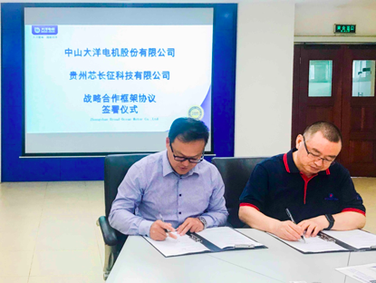 上圖為大洋電機董事長魯楚平(右)和芯長征董事長朱陽軍(左)現(xiàn)場簽約